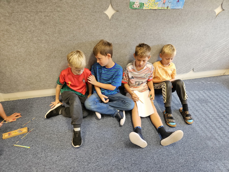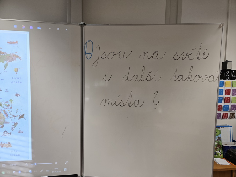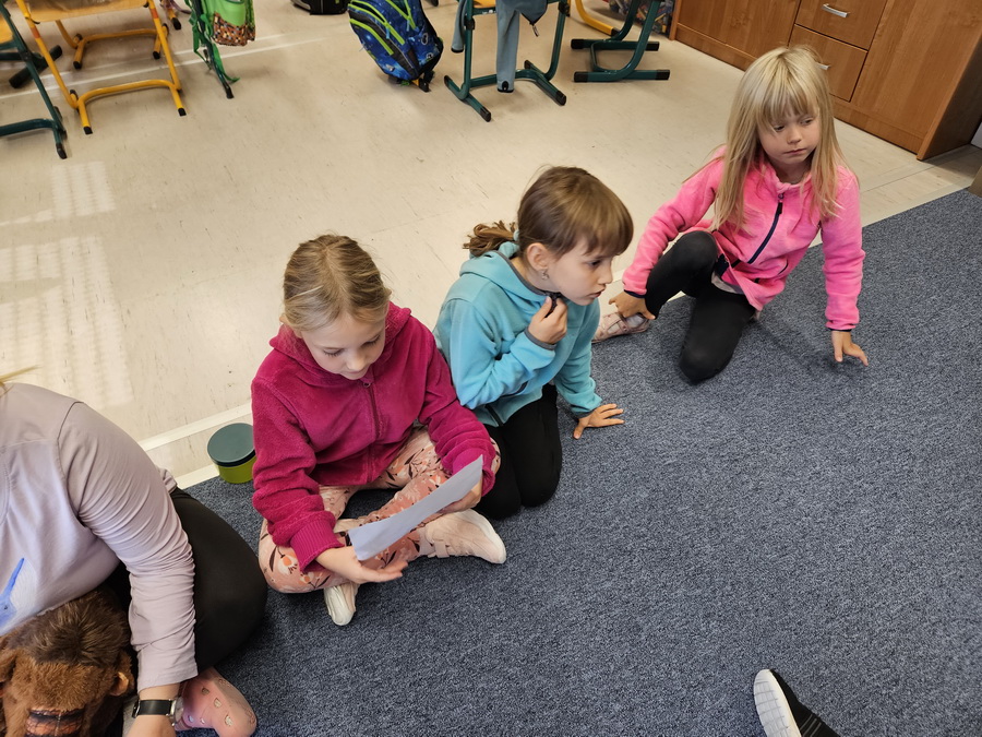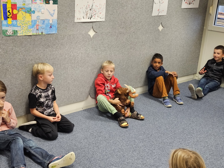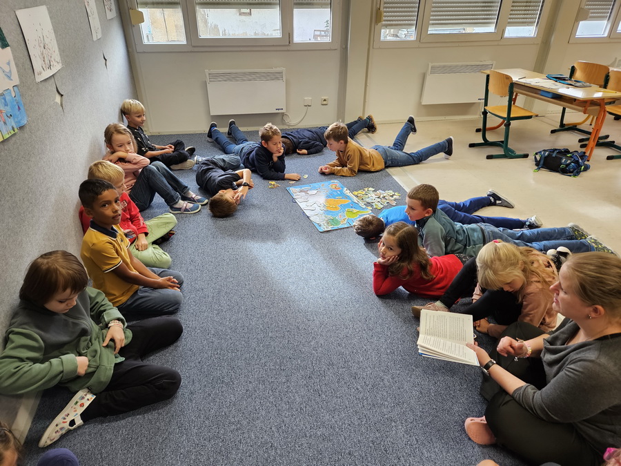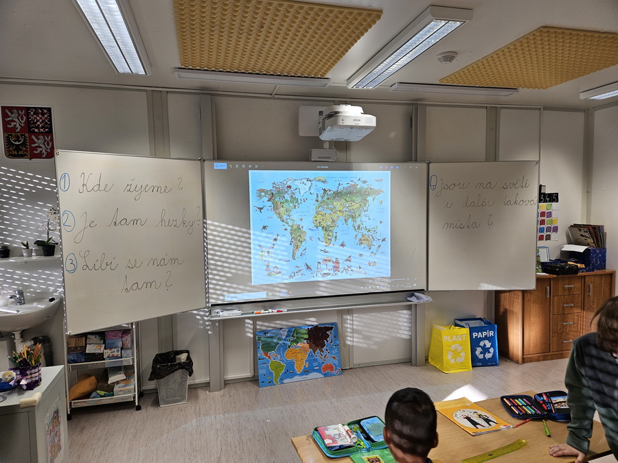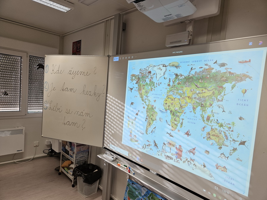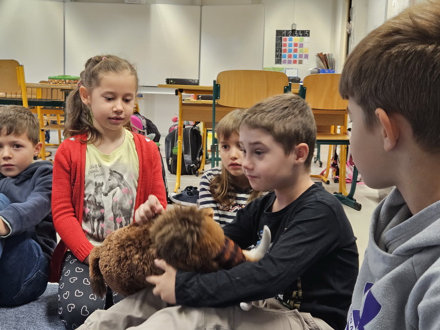Ve třídě jsme se pak ponořili do tématu „Kde jsme na světě nejraději“. Každý z nás měl možnost sdílet své oblíbené místo – ať už to bylo doma, na chalupě, u babičky nebo třeba na hřišti. Povídali jsme si o tom v kruhu, kde nás doprovázel náš třídní maskot, který nám pomáhá lépe se poznat a naslouchat si.