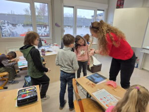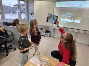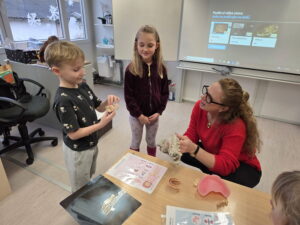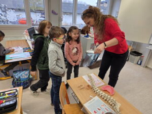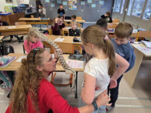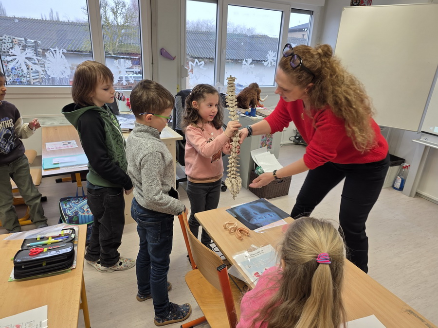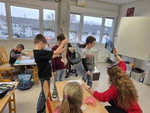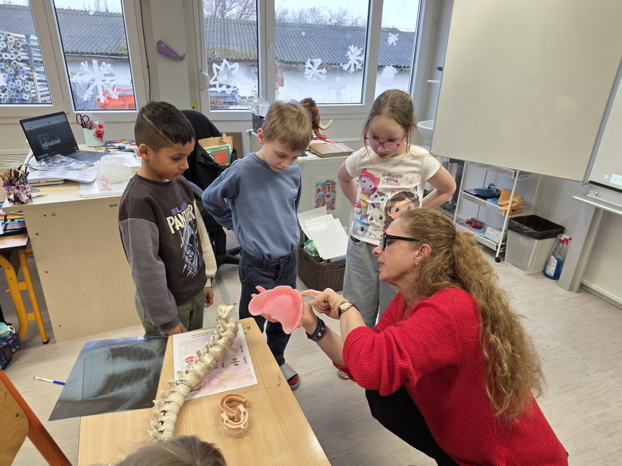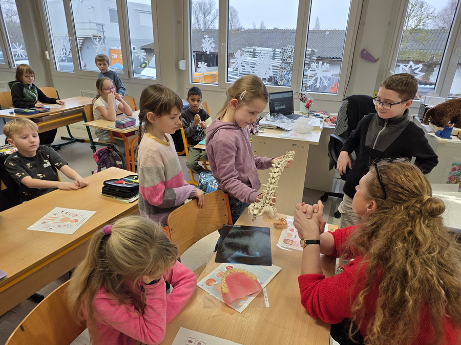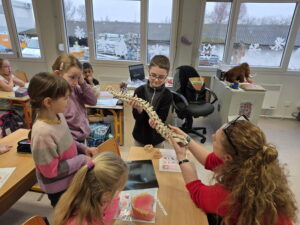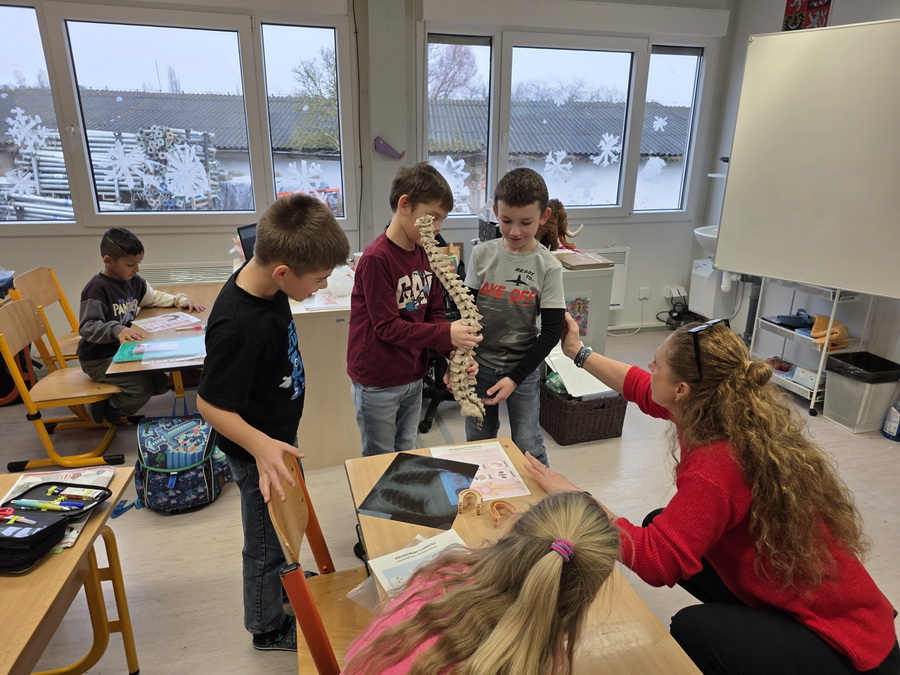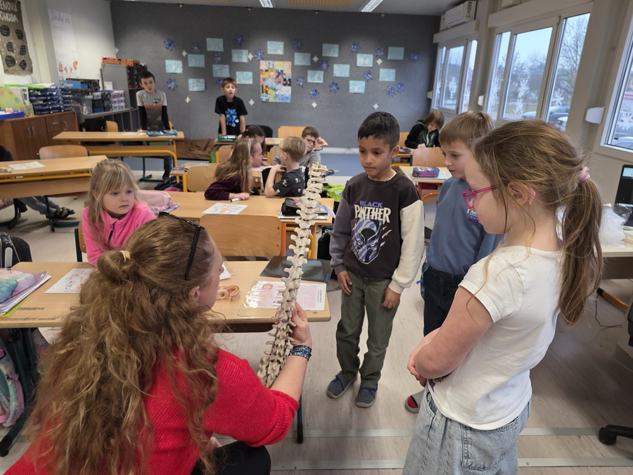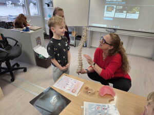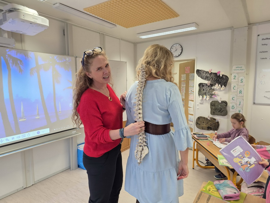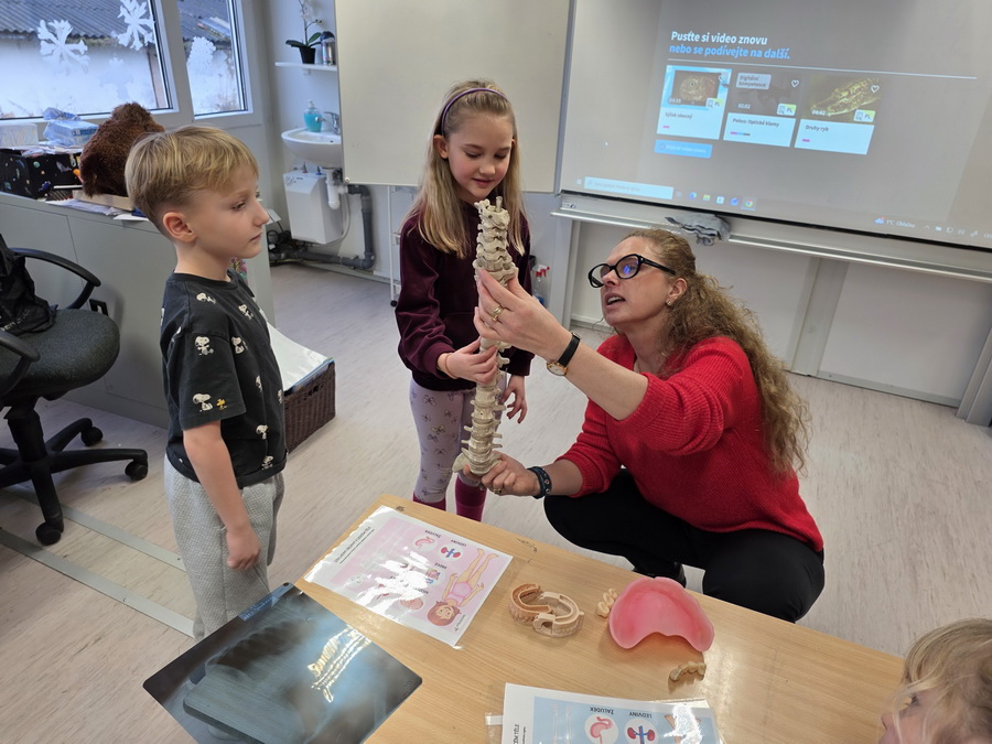 Ukázali jsme si také páteř, která drží naše tělo vzpřímené a chrání míchu. Děti si s velkým zájmem prohlédly model a vyzkoušely si, jak se tělo ohýbá a pohybuje díky obratlům.