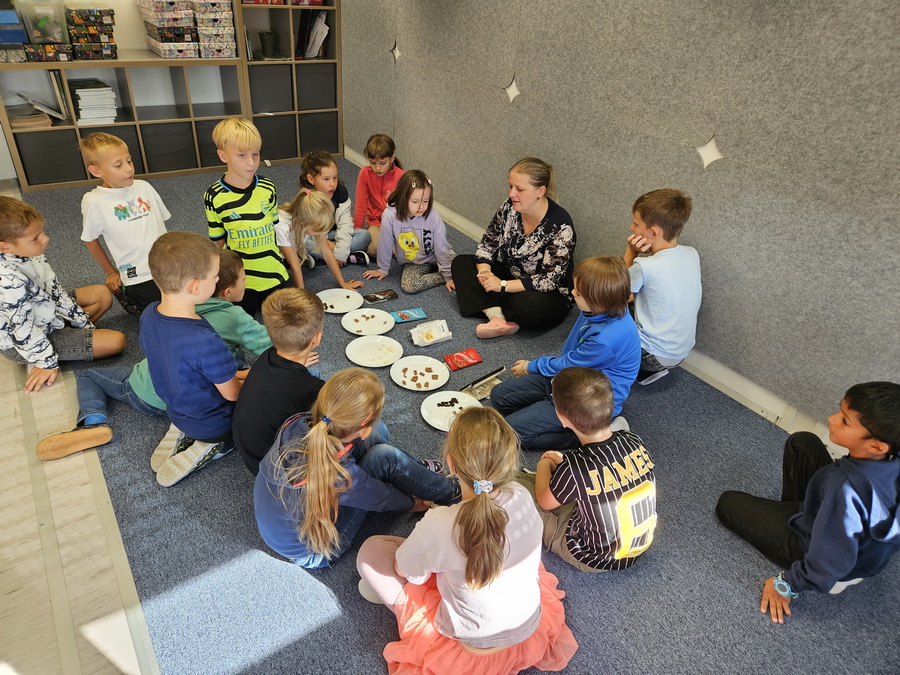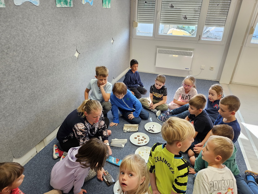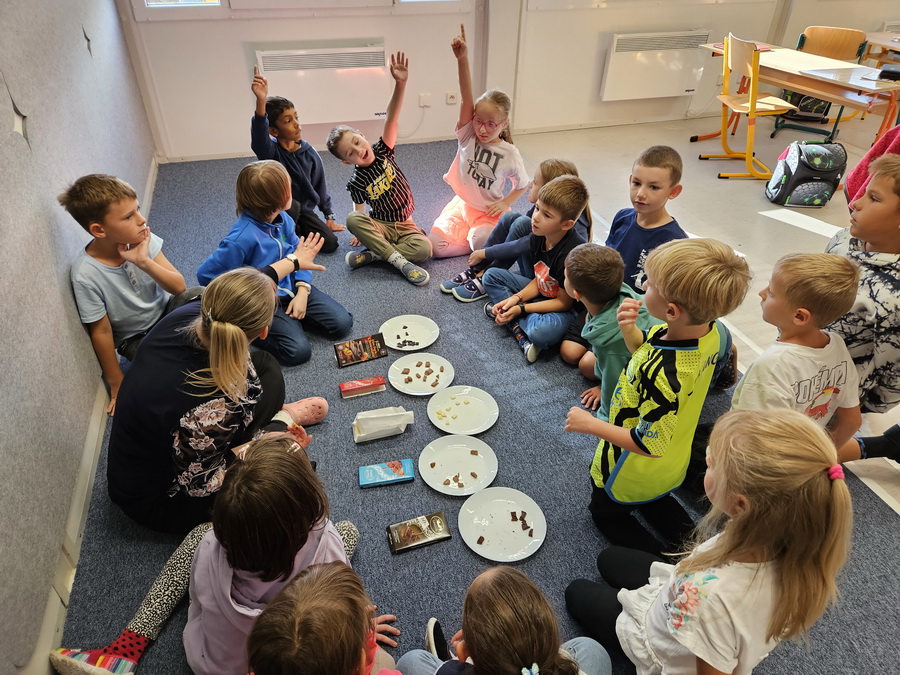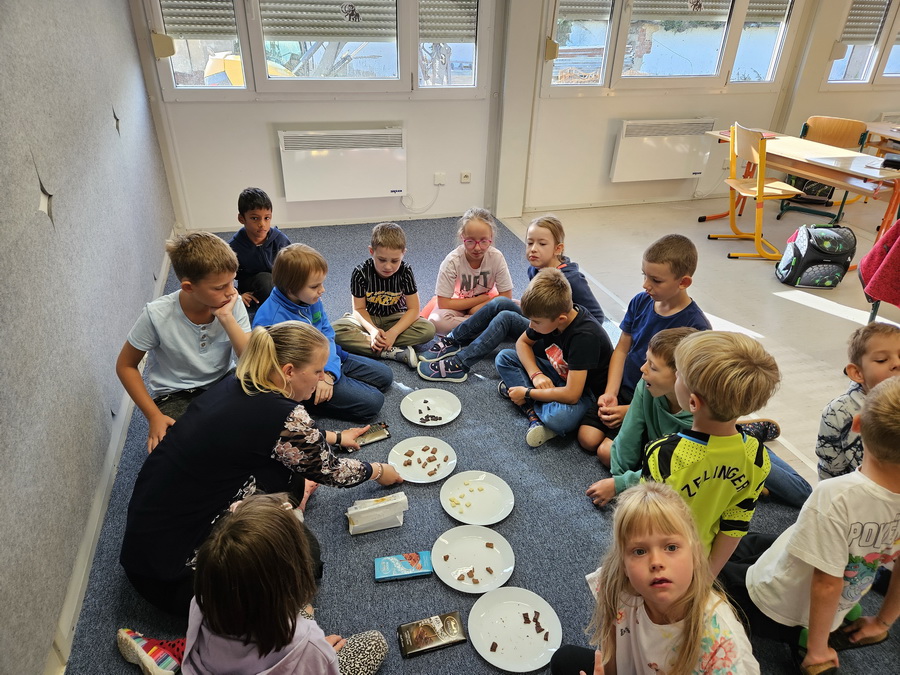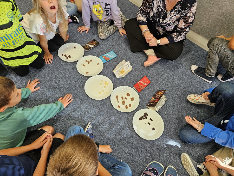 Největší radost dětem udělala paní učitelka, která pro ně připravila opravdovou degustaci různých druhů čokolády. Děti ochutnávaly, porovnávaly a hodnotily, která jim chutná nejvíc. Degustace byla pro všechny velkým zážitkem a děti si ji moc užily.