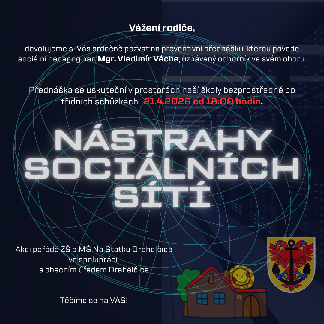 srdečně Vás zveme na preventivní přednášku na téma nástrahy sociálních sítí, kterou povede zkušený sociální pedagog Mgr. Vladimír Vácha. Přednáška se koná dne 21.4. od 18:00 po třídních schůzkách a je pro rodiče zdarma. Tým ZŠ a obec Drahelčice