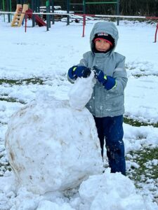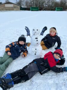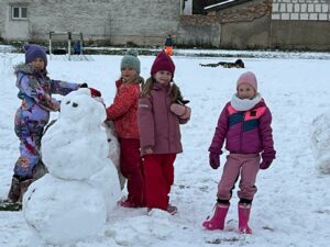 Dnes byli sněhuláci obzvláště obrovští! Naši malí stavitelé se do toho pustili s takovou vervou, že se jim podařilo vytvořit skutečné sněhové obry. Válely se obrovské koule, co sotva unesli, a na tvářích dětí se zračilo soustředění a odhodlání.