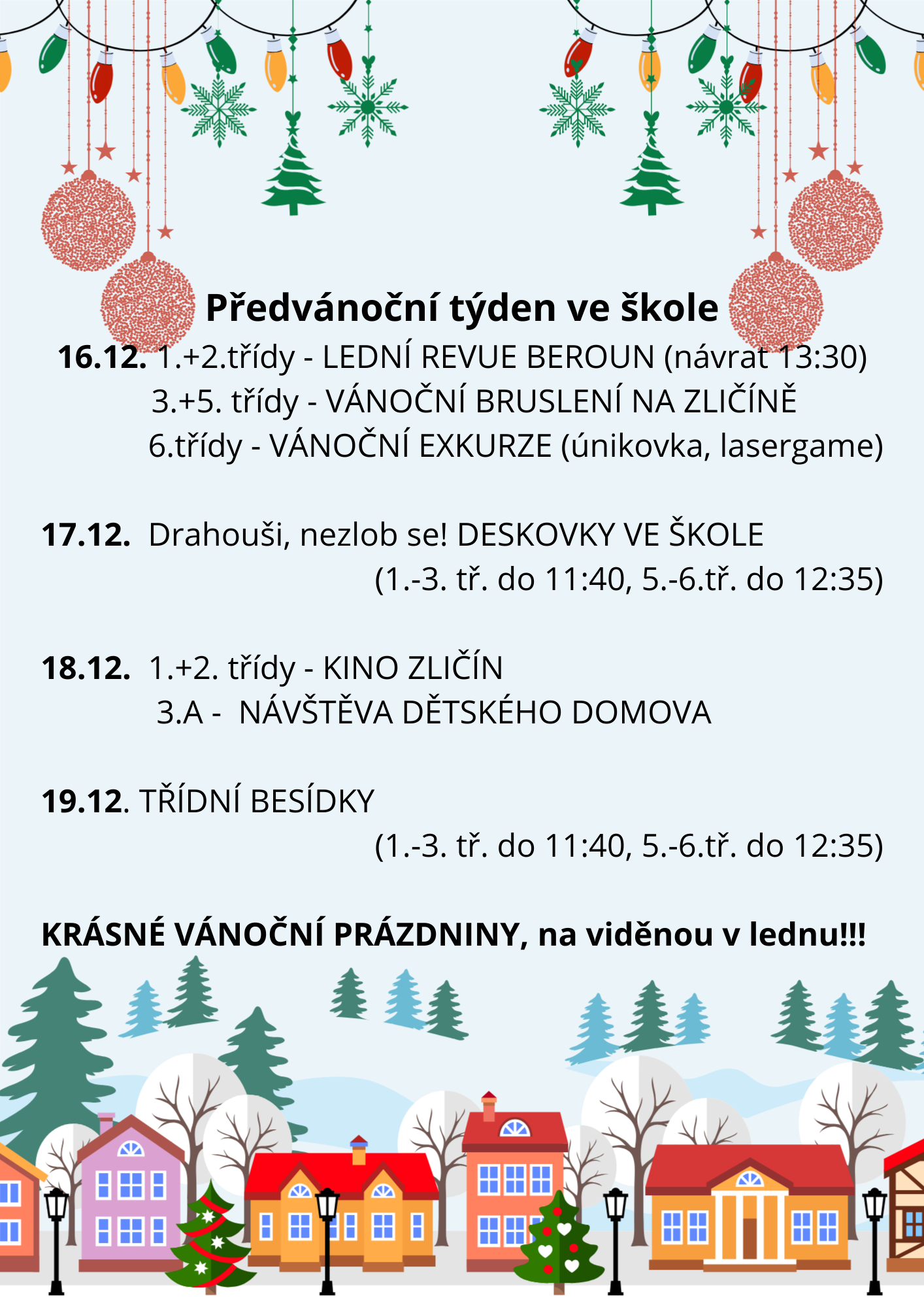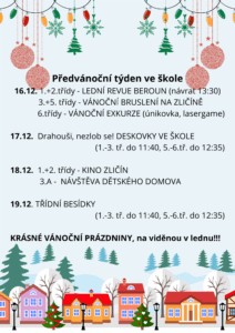 Milí rodiče, srdečně Vás zveme na Vánoční adventní odpoledne, které se uskuteční 11. 12. 2025 od 16:00 do 18:00 hodin v prostorách naší školy.