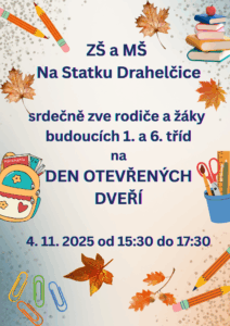 připomínáme, že ve dnech 30. 10. a 31. 10. 2025 bude z provozně-technických důvodů vyhlášeno ředitelské volno.