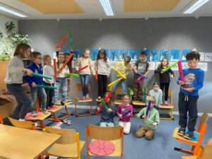 Hudební výchova v 1.A rozhodně není jen o zpívání v lavicích. Tentokrát jsme hudbu pořádně rozhýbali. Děti si vyzkoušely rytmus pomocí barevných hudebních trubek a zapojily celé tělo. Tleskali jsme, ťukali, poslouchali se navzájem a hledali společný rytmus. Hudina byla plná pohybu, soustředění i radosti. Každý měl svůj nástroj a svou roli. Děti se učily vnímat tempo, reagovat na pokyny a spolupracovat jako jeden hudební tým. Někdy to byl pořádný koncert, jindy zase tiché naslouchání a zkoušení nových kombinací zvuků. Hudební výchova... Celý článek >>