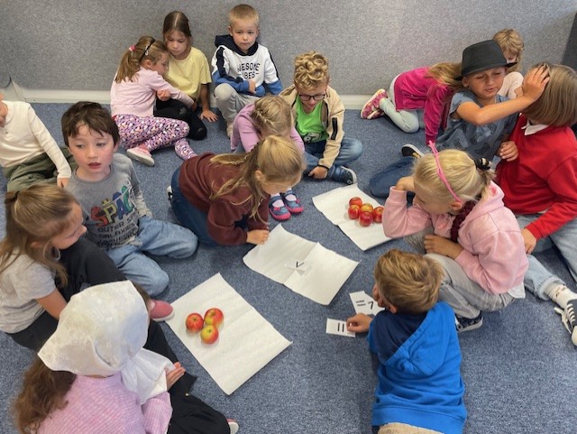 Na lavicích se tak objevily krásně červené plody a spolu s nimi i „živá“ babka a dědek v podání samotných dětí. Učení se rázem proměnilo v hravou scénku, ve které se počítalo, porovnávalo a samozřejmě také zpívalo.