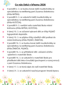 V pondělí 9. 3. navštíví naše mateřská škola místní knihovnu (třída MYŠEK, KOČIČEK). V pondělí 9. 3. se uskuteční další muzikohrátky se specialistkou na wellbeing paní Zuzanou Bobekovou (třída KOČIČEK). V pondělí 2. 3. se budou konat další muzikohrátky se specialistkou na wellbeing paní Zuzanou Bobekovou (třída MYŠEK). V úterý 10. 3. se zúčastní vybrané děti ze třídy PEJSKŮ logopedické depistáže. V úterý 10. 3. se půjdou třídy mladších dětí podívat do místní knihovny (třída PEJSKŮ, ŽABIČEK). V pondělí 16. 3. se budou konat... Celý článek >>