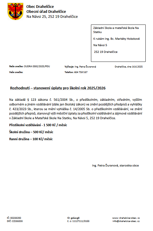 v tomto školním roce dojde ke změně výše měsíční úplaty za předškolní vzdělávání a zájmové vzdělávání. Platbu prosím proveďte přes Platební portál Středočeského kraje, usnadníte nám tím identifikaci Vaší platby. Děkujeme !