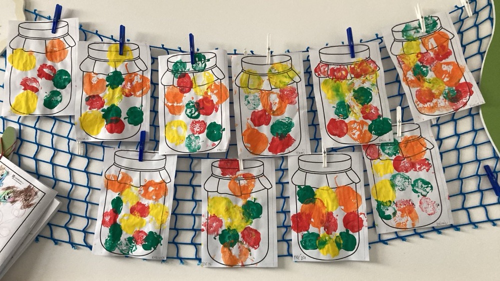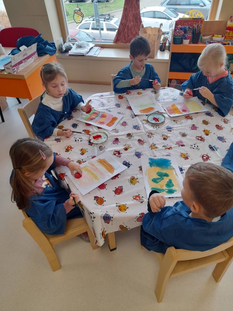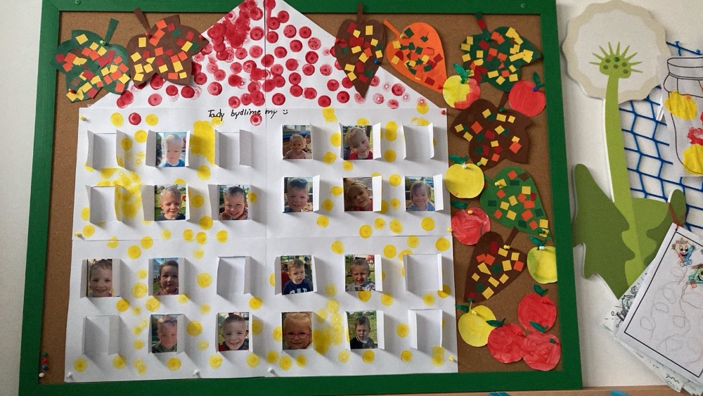 Podzim do naší mateřské školy přinesl spoustu barev, nápadů a radosti z objevování. Děti tvořily obrázky pomocí razítek z jablka a malovaly různými technikami, díky čemuž vznikly originální podzimní výtvory. Společně jsme si upekli jablečný závin, vyráběli papírové draky a povídali si o podzimních plodech a ovoci. Na vycházkách děti sbíraly kaštany, které pak využily při hrách i cvičení.