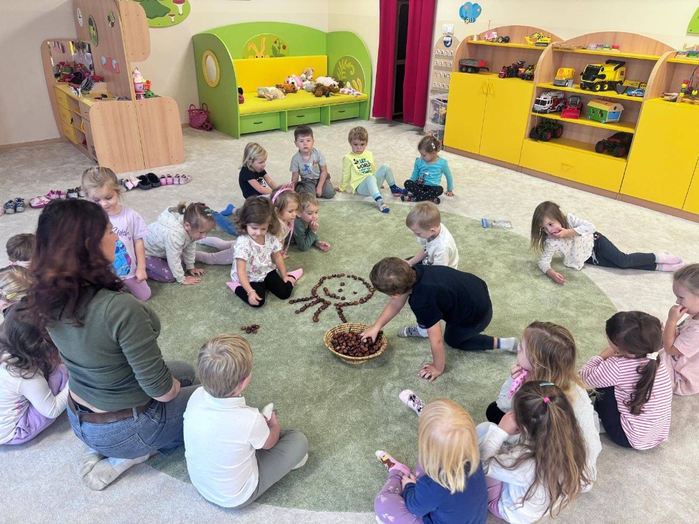 Z kaštanů skládaly různé obrazce a zkoušely, kolik jich unesou v dlaních. Celé podzimní období jsme tak prožili v duchu tvořivosti, pohybu a radostného objevování přírody kolem nás.