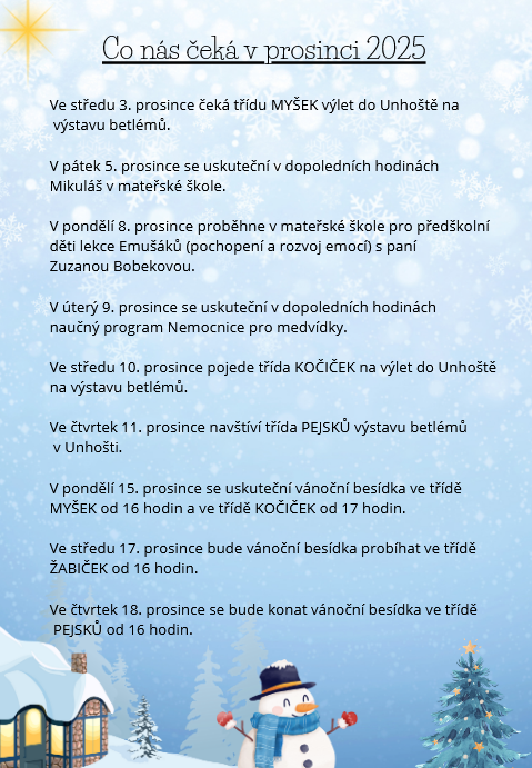 - V pondělí 15. prosince se uskuteční vánoční besídka ve třídě MYŠEK od 16 hodin a ve třídě KOČIČEK od 17 hodin.