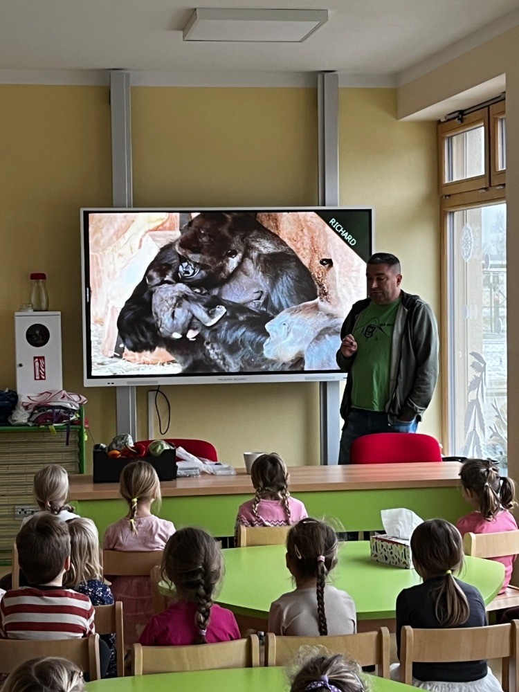 Naši mateřskou školu navštívil 5. 2. velmi milý a vzácný host ze Zoologické zahrady hl. m. Prahy, pan Marek Ždánský, který pracuje jako ošetřovatel goril. Přijel dětem poutavě vyprávět o jejich životě a přiblížit jim svou každodenní práci.