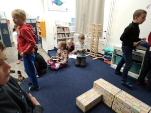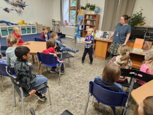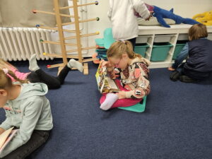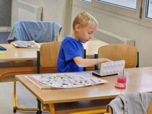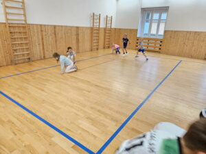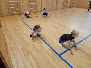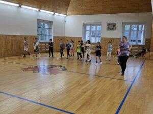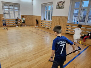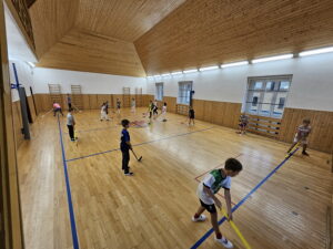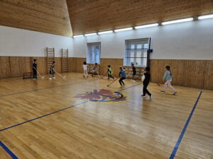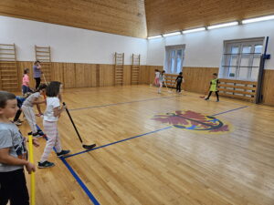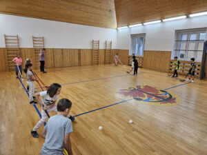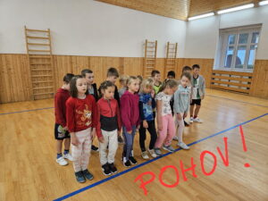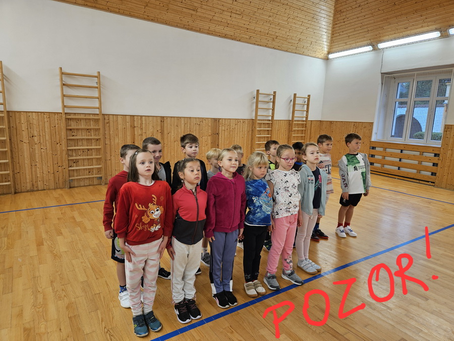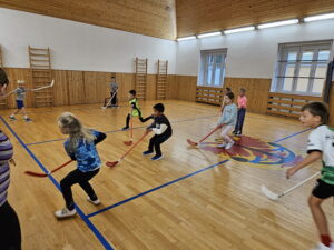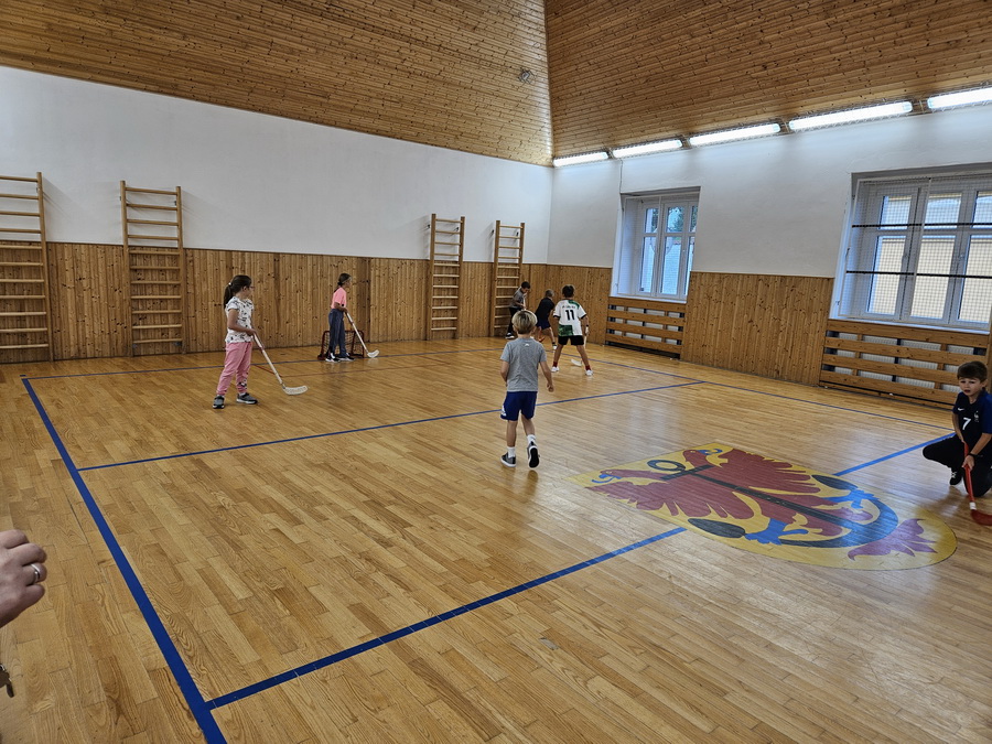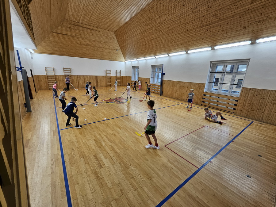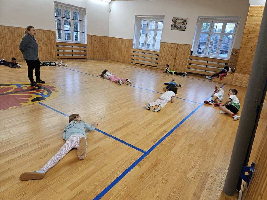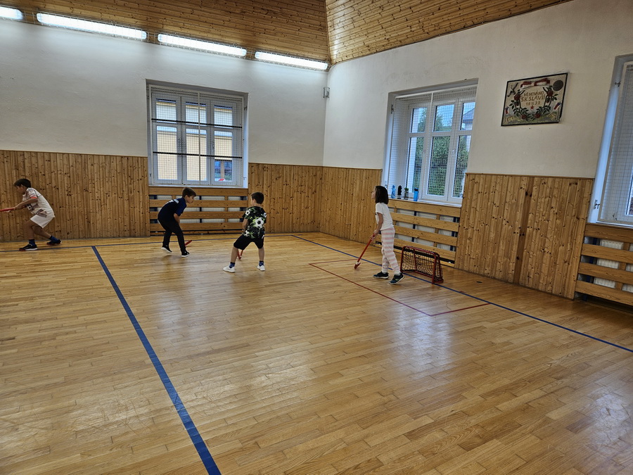 Na hodinách tělesné výchovy jsme trénovali základní povely „POZOR“ a „POHOV“. Paní učitelka děti učila, jak správně běhat a dýchat, aby si pohyb užívaly a zároveň si neublížily. Hodinu jsme zakončili oblíbeným florbalem, při kterém si děti užily spoustu zábavy a týmové spolupráce.