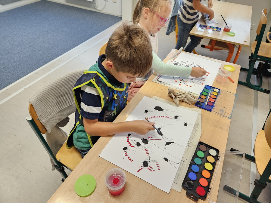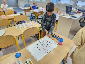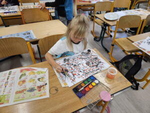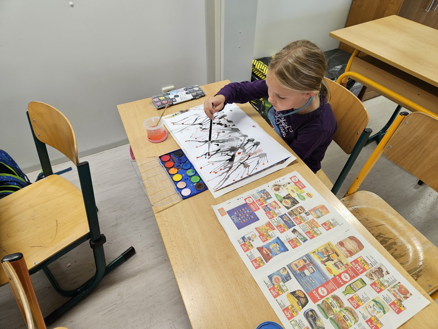 V průběhu týdne jsme se také věnovali výtvarné činnosti. Pomocí barev a brček děti tvořily krásné šípkové keře, které nám teď zdobí třídu a připomínají podzimní atmosféru.