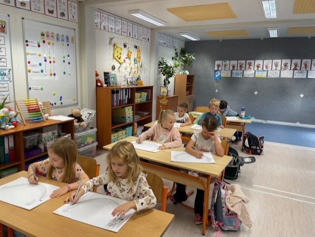 A protože správný písař musí mít uvolněnou ruku, nechyběly ani uvolňovací cviky – kroužky, smyčky i vlnky, které nám pomáhají připravit se na psaní vázaného písma. Děti si vše vyzkoušely s nadšením a radostí, a mnozí už zvládnou napsat první písmenka s lehkostí a úsměvem.