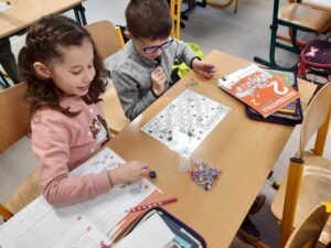 Dnešní hodina matematiky byla pro žáky 2.B velkým milníkem – poprvé se totiž vydali do světa násobilky. A aby to nebylo jen počítání na papíře, pustili jsme se do toho hravou a dobrodružnou formou.