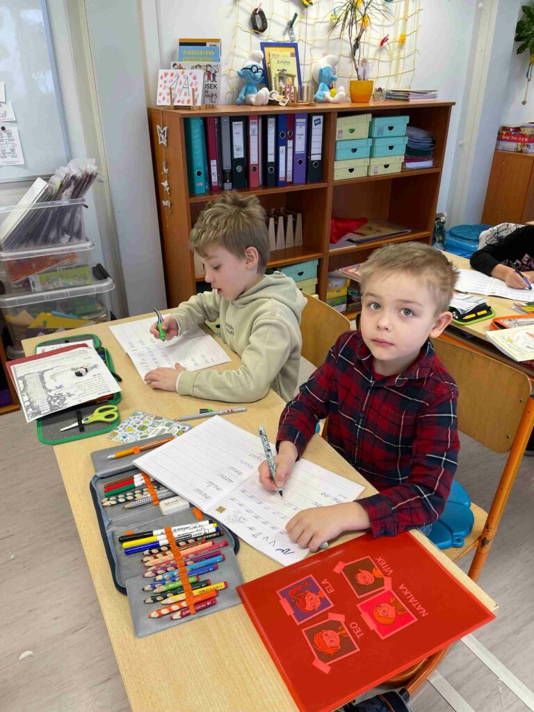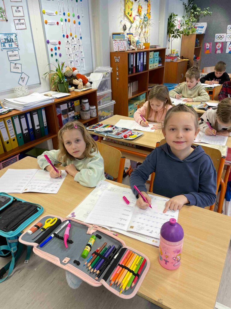 Po dlouhém trénování tužkou se děti dočkaly a poprvé vzaly do ruky skutečná pera. Nadšení bylo veliké – nové pomůcky, nové sešity a pocit, že se z nich pomalu stávají opravdoví školáci.