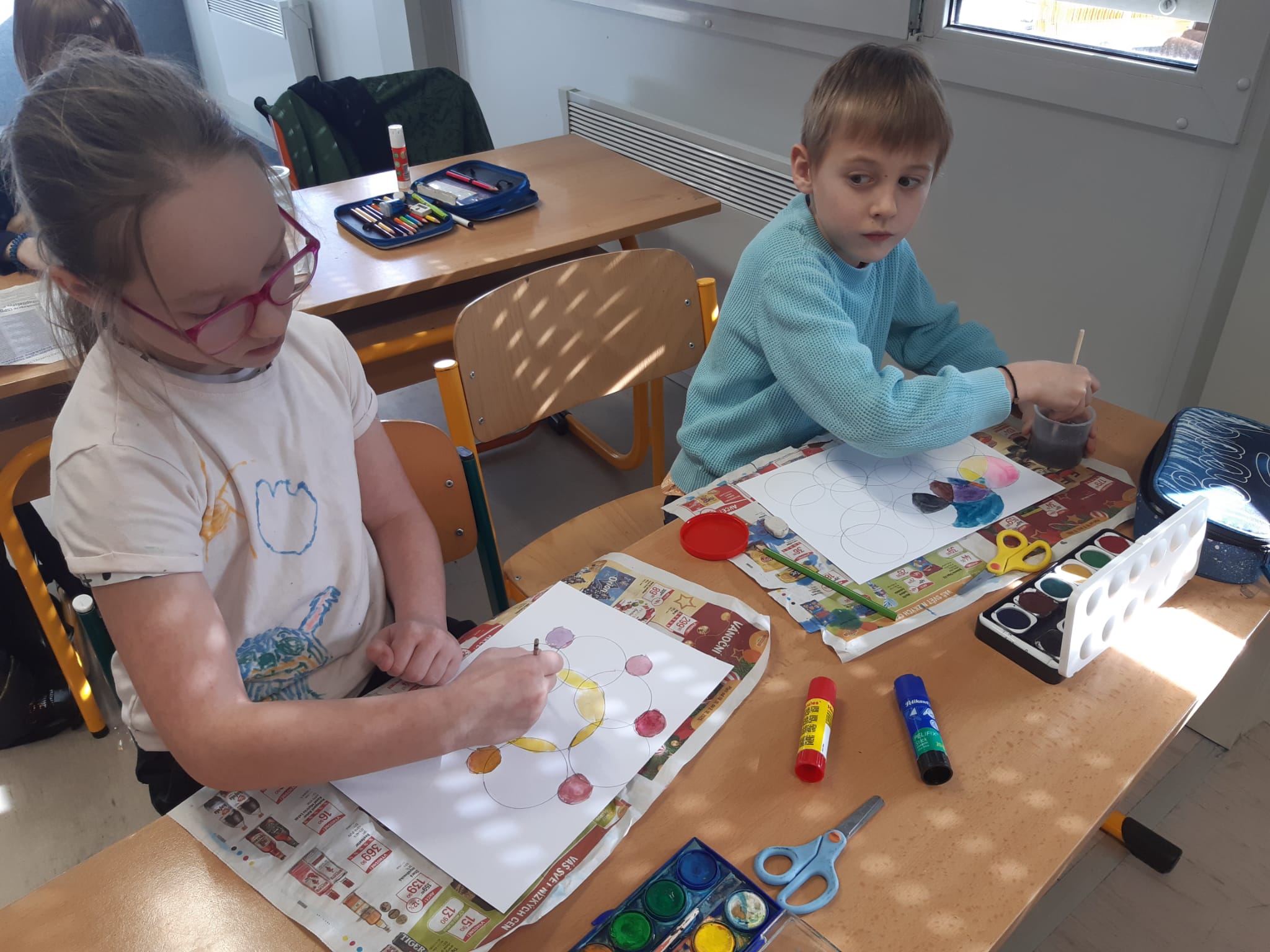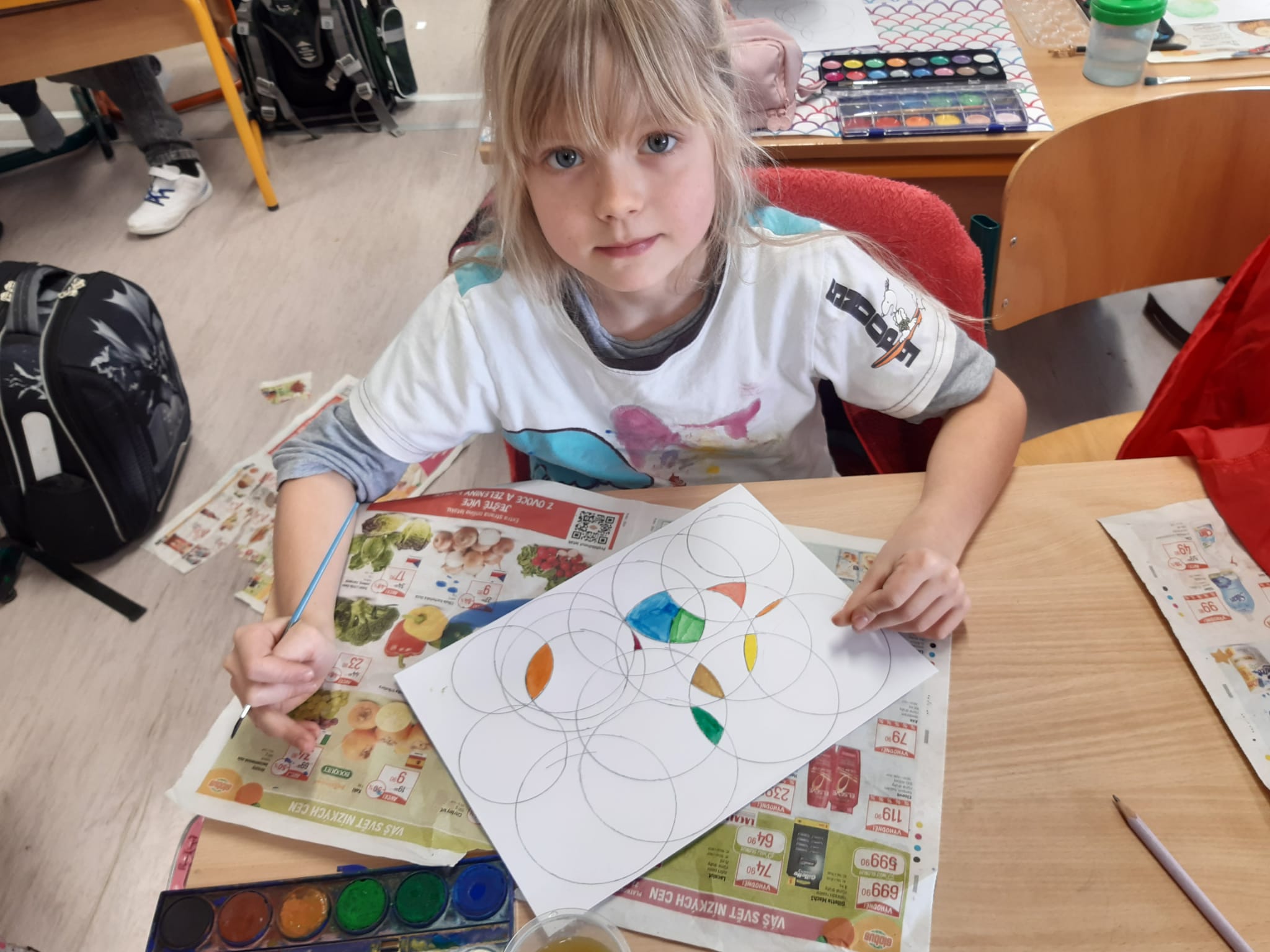 S maximálním nasazením se děti pustily do práce! Třída na chvíli utichla a bylo vidět, jak se děti noří do práce – soustředěně vybírají barvy, pečlivě dokreslují linie a přemýšlejí nad tím, jak jejich mandala bude vypadat. Některé obrázky zářily veselými odstíny, jiné působily harmonicky a uklidňujícím dojmem.